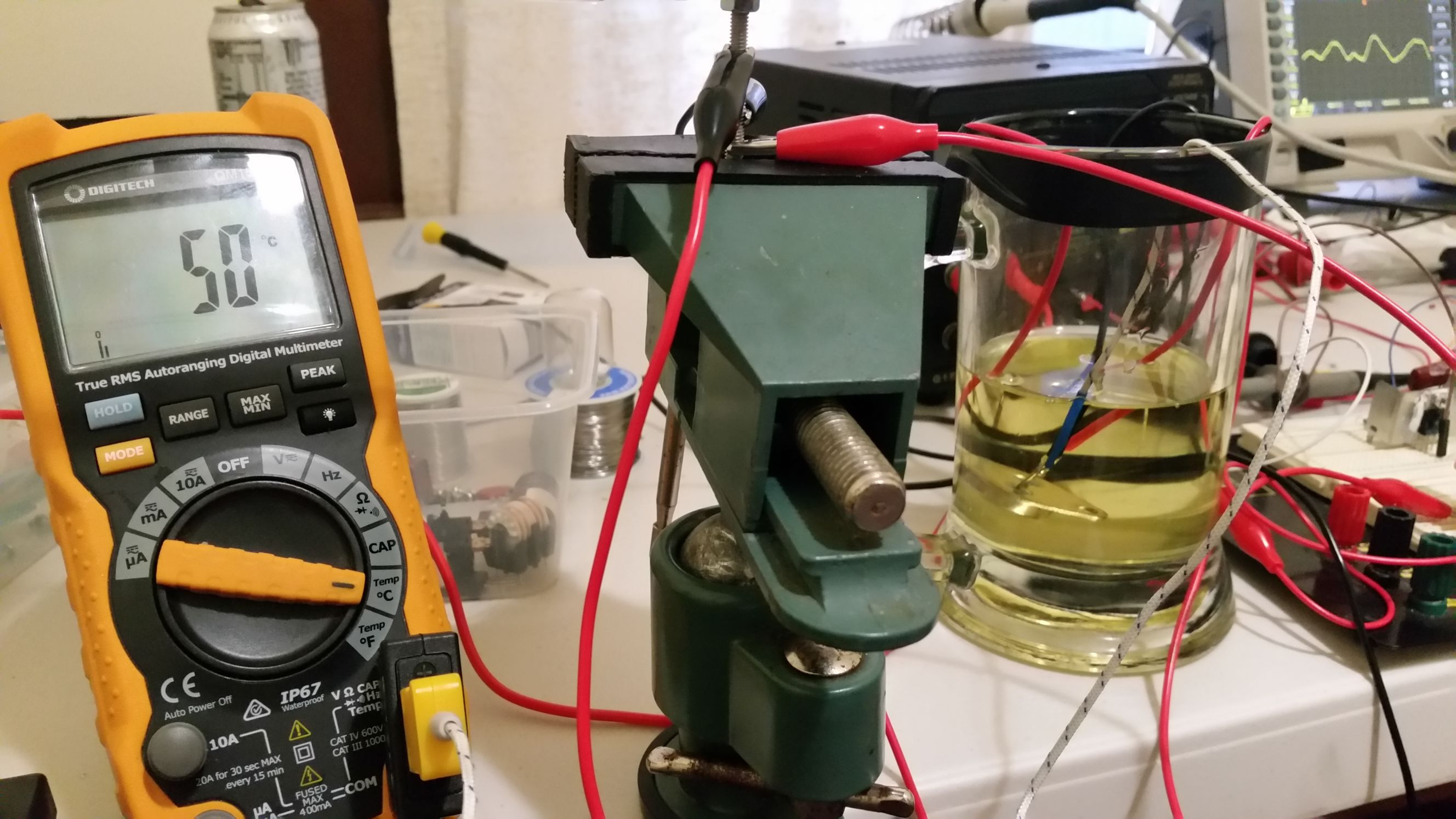 The soy oil did a great job of cooling the transistor, it only gets up to about 50C. I used the oil because I did not have a heat-sink big enough plus the cooling solution only needed to be temporary.