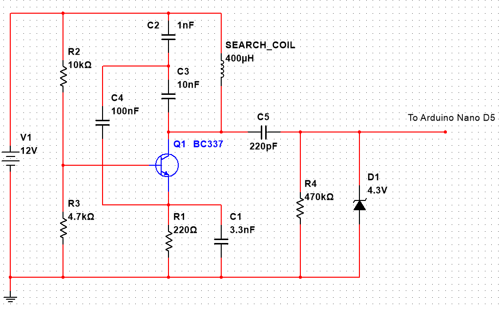 In this design, instead of using a traditional reference oscillator, an Arduino is used to measure the frequency of the search oscillator. When the Arduino detects a change in frequency, it can activate an LED or a buzzer to indicate that a metal object has been detected.