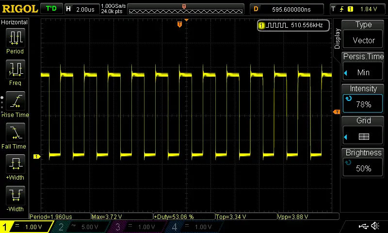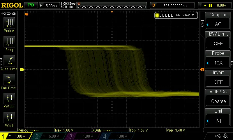 At first glance, the square-wave output doesn’t seem useful for our purposes—it looks completely predictable. But when we zoom in on the first falling edge, something interesting appears. The transition isn’t perfectly sharp; instead, it forms a slight blur. Some edges occur a little earlier, others a little later. Jittering perhaps by about +-2ns.