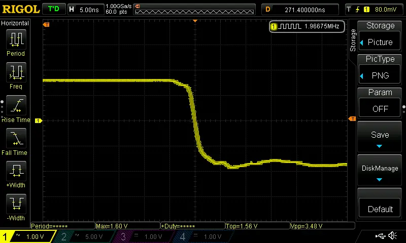 So, what’s interesting about all of this? Well, let’s take a another look at the jitter on the falling edge of the signal now the diode is in place: