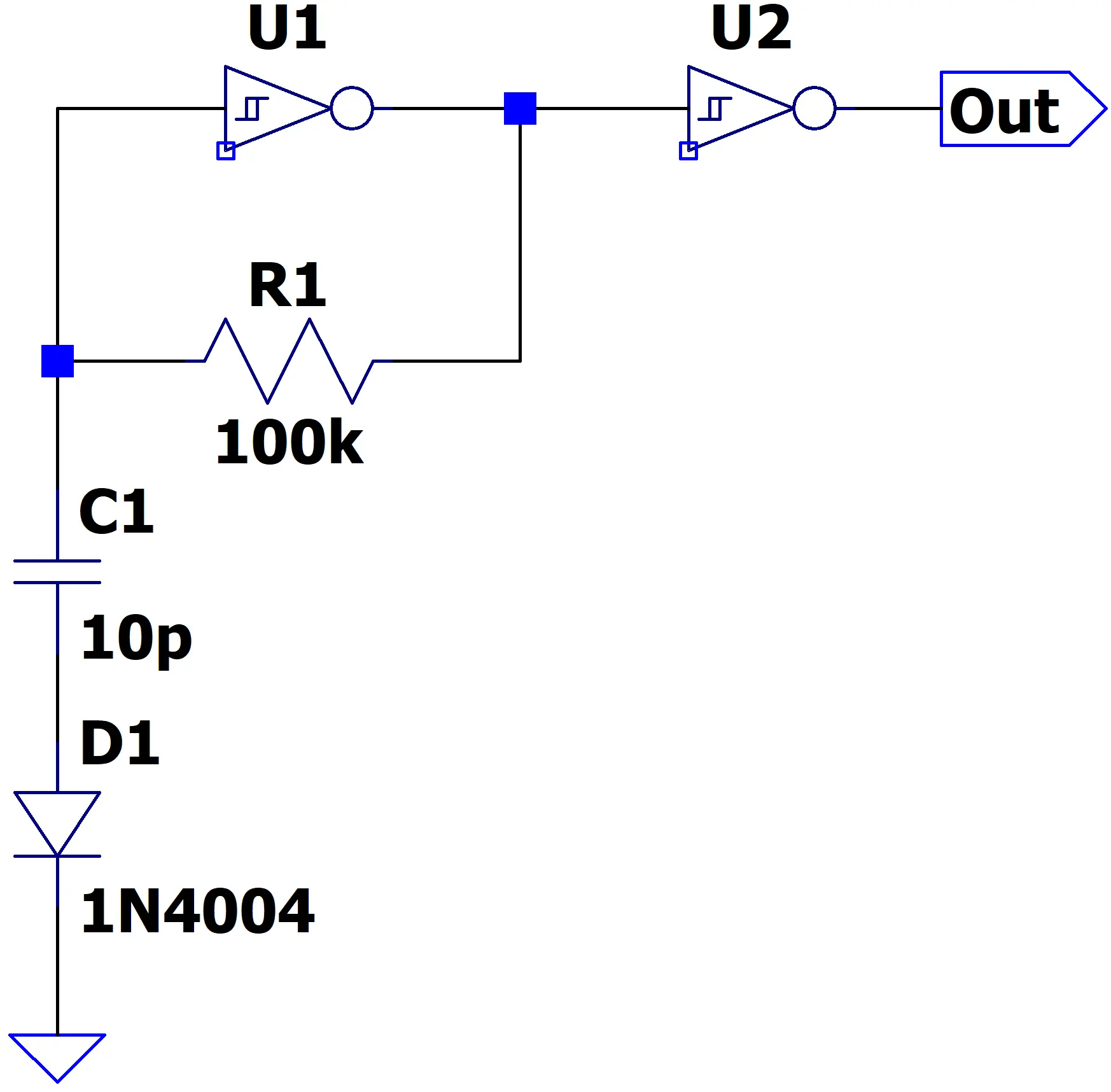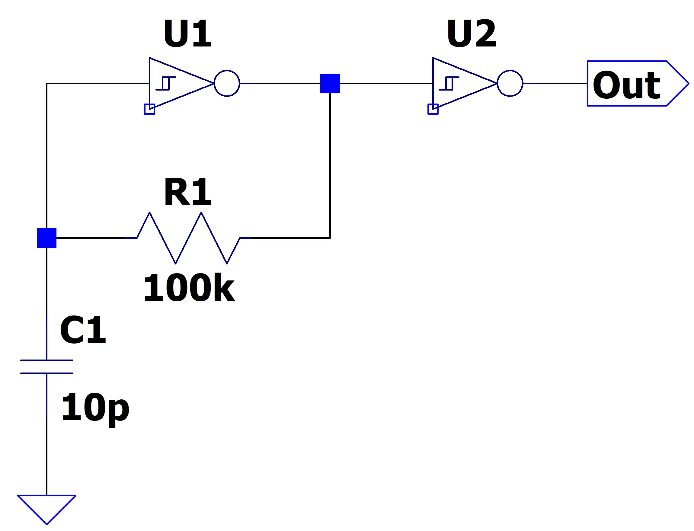 A second inverter from the same package acts to buffer U1’s output. This buffer isolates the oscillator from external disturbances and ensures that any loading or noise from downstream circuitry doesn’t interfere with the core oscillation behavior.