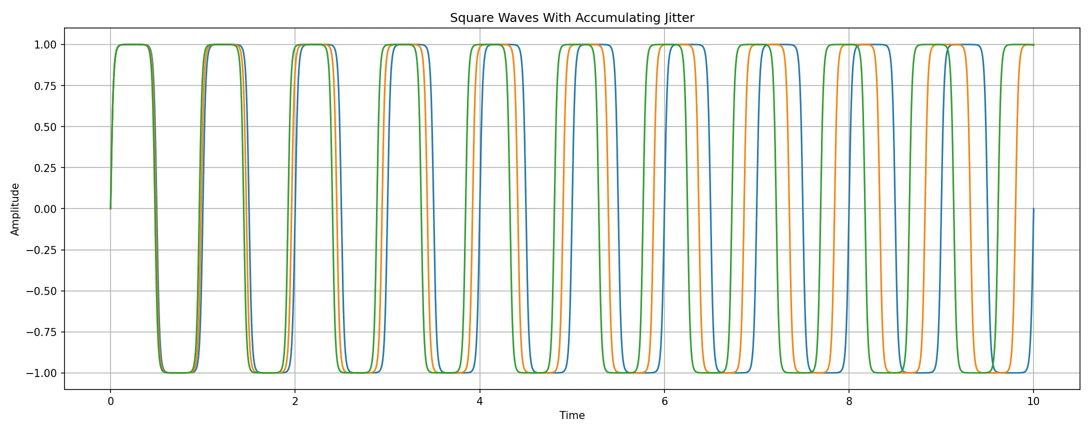 Within the first few wavelengths, the three signals are almost indistinguishable. But as time goes on, the accumulated jitter causes their phases to drift further and further apart. By the time we reach around ten wavelengths, the phase relationship has completely decorrelated — making it impossible to predict whether a digital sample taken at that moment will read as high or low.
