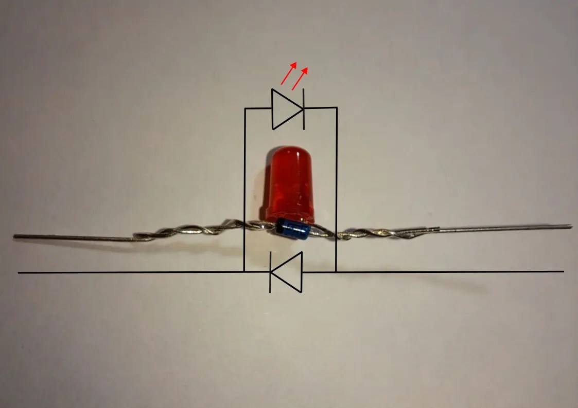 - Place the diode alongside the LED, with its legs parallel to the LED legs. Make sure the diode’s cathode is next to the LED’s anode.