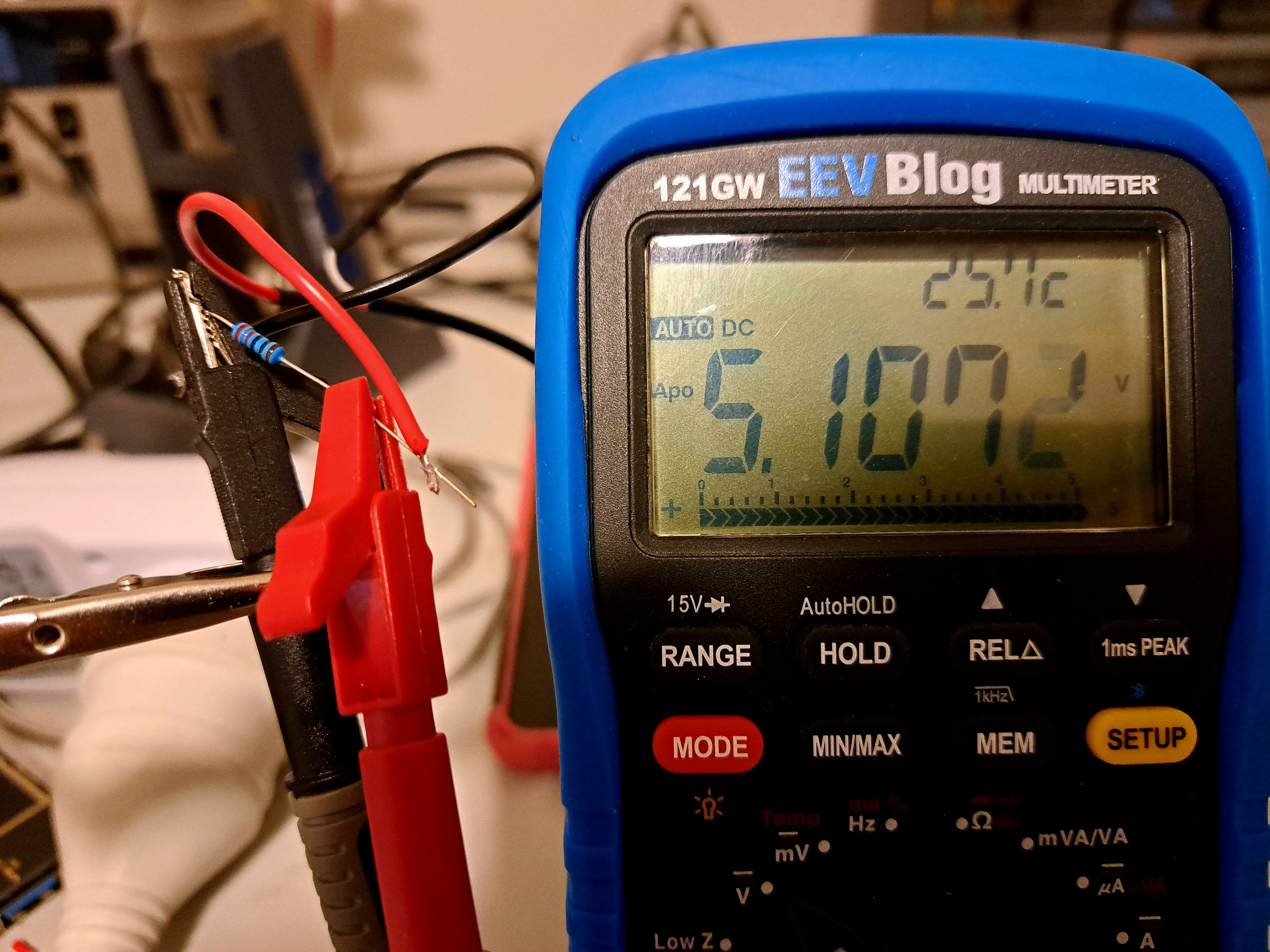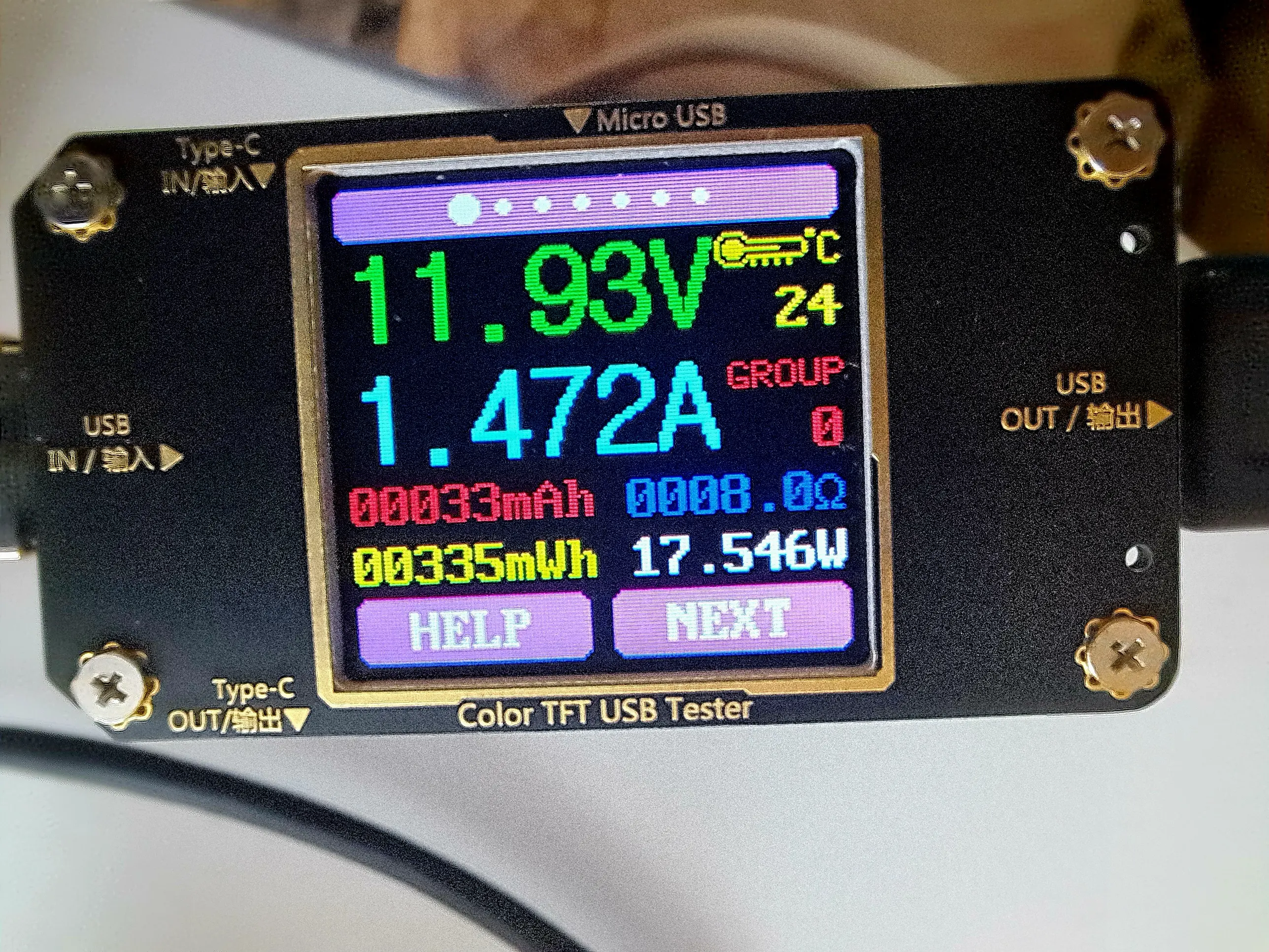 I set up a simple test to verify whether the charger can deliver its claimed output power. For this, I used an 8 Ω power resistor as a dummy load. At 12 V, the resistor should draw 1.5 A, resulting in a power draw of 18 W (12 V × 1.5 A), which is essentially the charger’s maximum per-port output.