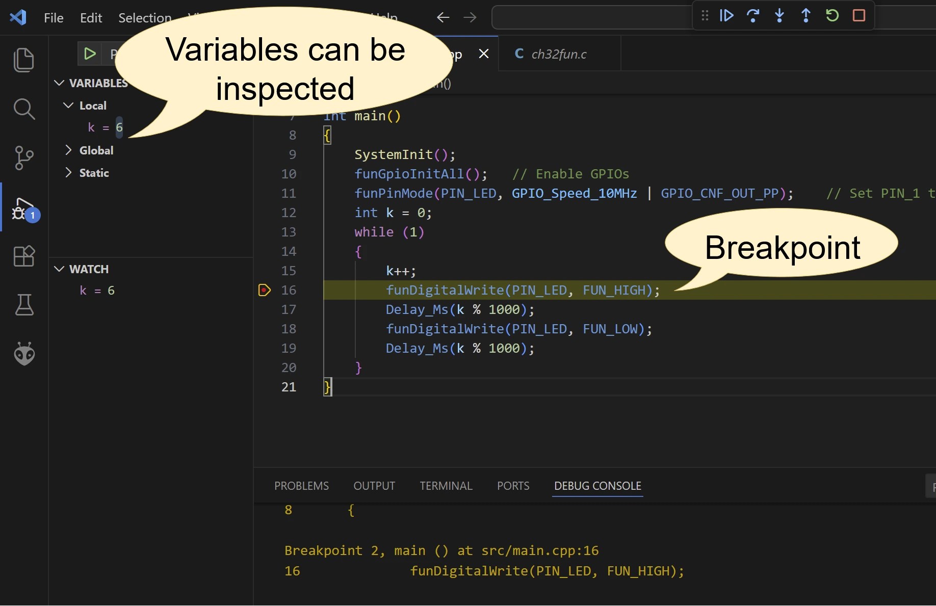 "ch32fun.h" <stdio.h>// use defines to make more meaningful names for our GPIO pins PIN_LED PD3int main(){ SystemInit(); funGpioInitAll(); // Enable GPIOs funPinMode(PIN_LED, GPIO_Speed_10MHz | GPIO_CNF_OUT_PP); // Set PIN_1 to output while (1) { funDigitalWrite(PIN_LED, FUN_HIGH); Delay_Ms(1000); funDigitalWrite(PIN_LED, FUN_LOW); Delay_Ms(1000); }}